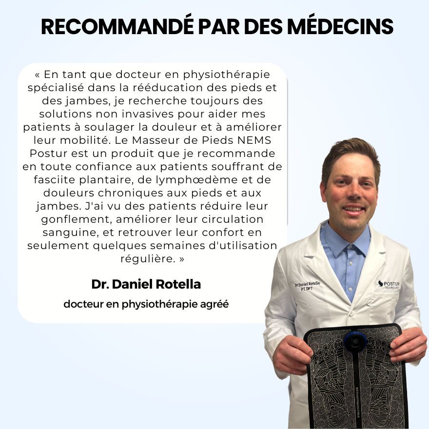 Le Dr Rotella, un professionnel de la santé renommé, a étudié et cliniquement prouvé les incroyables bienfaits du Masseur de Pied NEMS Postur. Grâce à ses recherches dédiées, il a déterminé que ce masseur est une forme de soin de rééducation efficace et sûre.