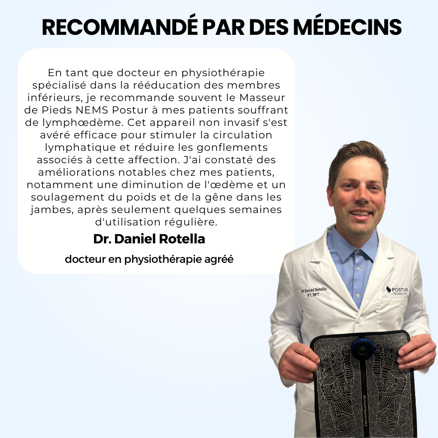 Le Dr Rotella, un professionnel de la santé renommé, a étudié et cliniquement prouvé les incroyables bienfaits du Masseur de Pied NEMS Postur. Grâce à ses recherches dédiées, il a déterminé que ce masseur est une forme de soin de rééducation efficace et sûre.